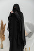 Enhance your look with this gracefully designed cape featuring open sleeves for effortless movement and perfect fluidity. The satin-trimmed edges add a luxurious touch, making it the ideal choice to refresh your abaya style while providing extra coverage in a modern and elegant way.