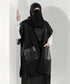 An elegant cardigan made from premium black wool, perfect for colder weather and extremely practical over any abaya. The design allows you to wear it open or closed, and it features leather pockets that add a refined, chic touch without exaggeration.
